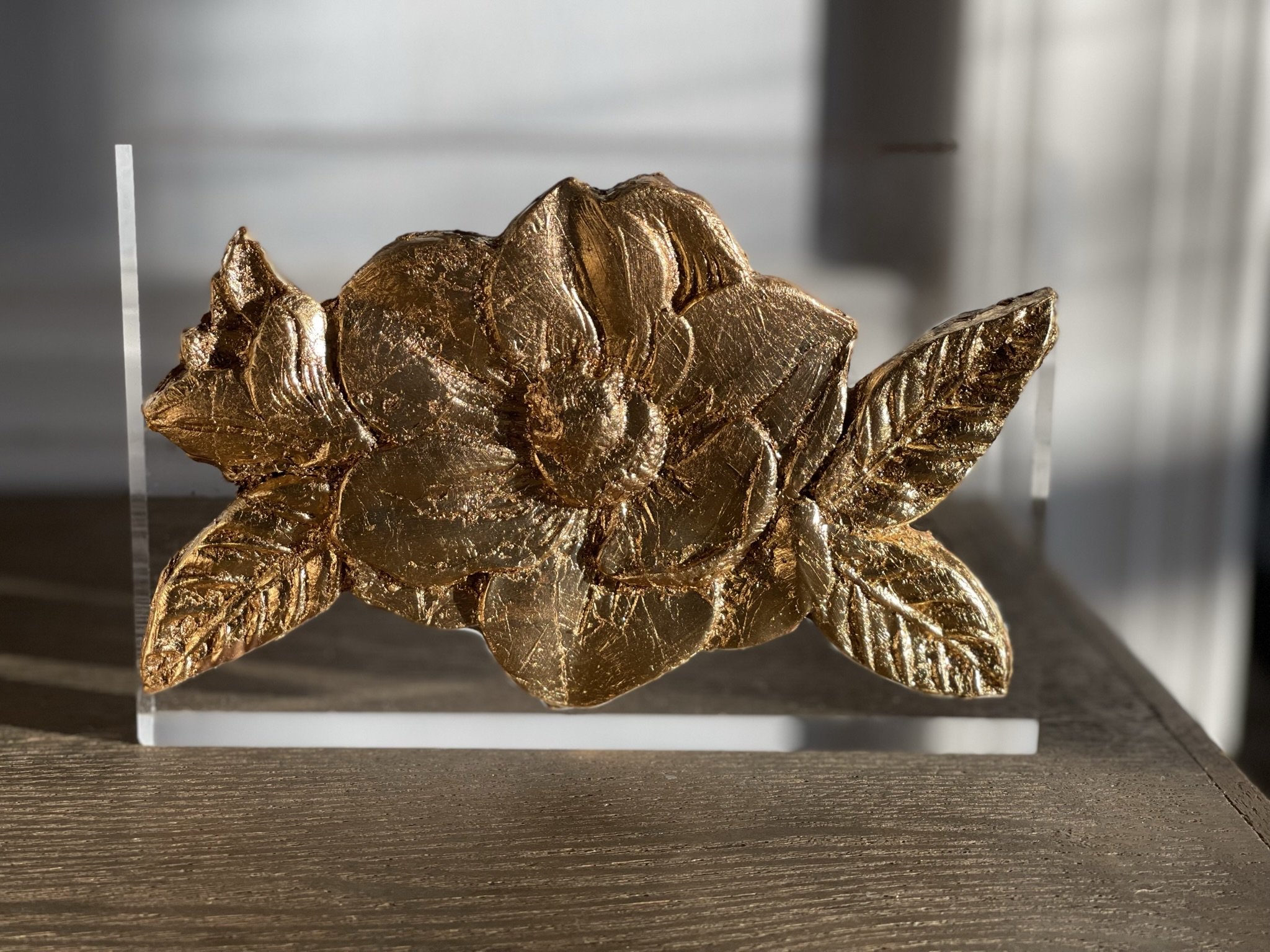 One-of-a-kind gold leaf magnolia blossom mounted to a 5”x6”x1” acrylic block. A card about the significance of the magnolia is enclosed with each work.